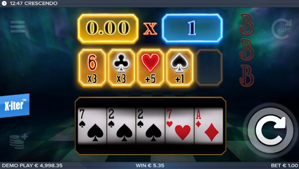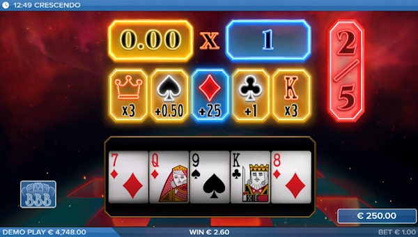 Crescendo is played on a 5-reel, 1-row grid with a single payline. Instead of traditional symbols, the game uses a full deck of 52 playing cards. Wins are determined by poker hands formed across the five visible cards. Each winning hand triggers a respin, with sticky symbols and new cards replacing only the losing ones. The Feature Row above the reels activates special modifiers that enhance payouts and gameplay dynamics.